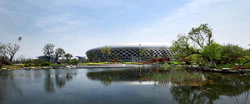 據夏修智介紹,奧體公園是工程的主要景觀節點,位于奧體中心西北側,面積約5萬平方米,是一座集娛樂、運動為一體的特色濱水運動公園,也是整個奧體中心的“綠肺”。一條蜿蜒的河流將公園劃分為東部運動區和西部休閑公園區。運動區緊挨訓練中心,東側便是足球場、籃球場和排球場,運動后就能感受到融入大自然的清新;休閑公園區包括入口廣場、樹陣廣場、以及河水匯聚而成的小人工湖,湖邊蘆葦迎風擺動,湖水清澈見底,鵝卵石鋪就的湖底清晰可見。整個奧體公園以中國古典園林為主、回歸自然的組團式造景手法,強調休閑、幽靜、生態自然。從西入口廣場的草坡,逐漸過渡到觀賞性強的觀花、觀葉園林樹種,配合灌木、草木、地被形成人為景觀,從西到東植物次第減少,層次不斷變化,形成了從自然生態狀綠化到人工幾何狀綠化的逐漸過渡,讓自然的活力與體育精神融為一體。