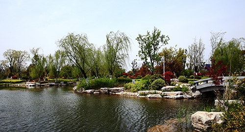 其中,人工湖面積7000平方米,小而精致,可謂是整個公園的“點睛之筆”。由親水平臺區,源頭區,中心湖面區,鄰水生態區,橋梁區構成。湖面區域貫穿整個工程,沒有自然條件的襯托,完全由人工園林造景手法完成,在鄰水景觀帶種植睡蓮、荷花、再力花、千屈菜、鳶尾、蘆葦等水生植物,營造生態岸線,同時選擇其他親水植物,如美人蕉、碧桃、楊柳、水杉作為過渡和背景,虛實結合,營造出多方位的景觀效果。湖面雖小,但結構完整,假山疊水,拱橋,原石臨水橋,湖邊卵石生態群落一應俱全。其中,景石主要使用了安徽的靈璧景石,約7000噸,堆疊出水源、暗橋、親水沿岸等景觀。