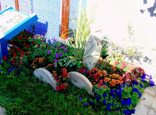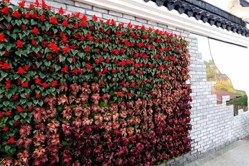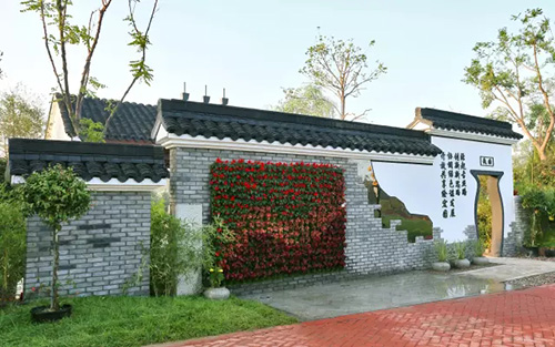 考慮到銀川的干燥氣候,垂直綠化墻植物的保濕成為難題。“浙江園”垂直綠化墻以無紡布為墻體材料,使用保濕性強的基質,優選植物種類,同時搭配滴灌系統,保證了綠化墻鮮花擁簇的景象。展園內的垂直綠化墻設計簡潔、曲線優美,與以錢塘江文化為主題的背景墻相互映襯,共同展現了新時期浙江園林景觀的不斷發展與創新。