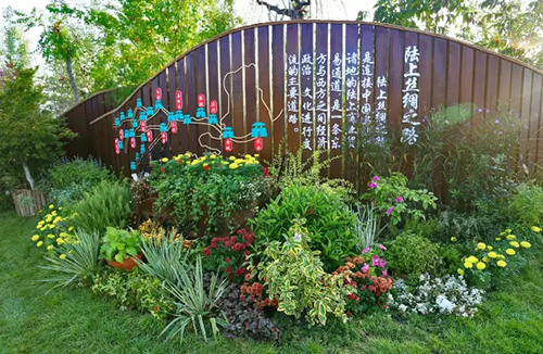 《絲?路》:“壯志西行追古蹤,孤煙大漠夕陽中。駝鈴古道絲綢路,胡馬猶聞唐漢風?!蔽羧瘴饔蚬诺赖姆比A猶在眼前,通過“絲?路”花境的營造,重走絲綢之路,感受不同時代的變化,寓意在新時期全面推動絲綢之路經濟帶的過程中,我們要以史為鑒,傳承絲綢文化,走好新絲路。