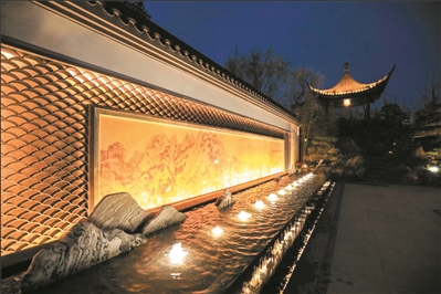 園區入口廣場,迎面是一組水墨墻照壁,圖案原型是“富春山居圖”的一部分。