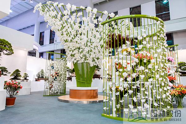 走進館內,各種浙江特色新優園林園藝植物產品、花藝作品、盆景作品等,讓人忍不住駐足停留。最引人注目的,則是以一朵朵白色的蝴蝶蘭花朵與仿竹構筑物營造的立體景觀,結合蒼翠欲滴的竹林背景和浙派山水盆景,營造出綠意盎然、生機無限的風景畫卷。寓意浙江是“綠水青山就是金山銀山”理論的發源地,表現浙江始終踐行“綠水青山就是金山銀山”的理念、大力推進生態文明建設取得的巨大成就。