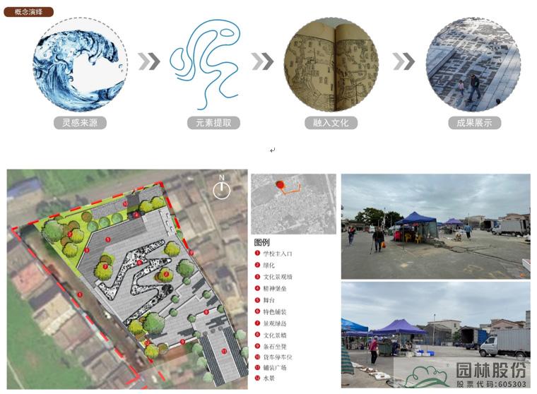 入口休閑廣場概念演繹設計說明:現狀場地主要為一片空地,由于南面是菜場,因此該場地在功能性上主要有貨車卸貨的功能,考慮村莊內可能舉辦大型祭祀活動或者紅白喜事,需要有大空間,所以在設計中留出了大片場地。因沿海城市,所以提取了海浪元素,結合當地歷史文化及村落肌理,做出如圖設計。