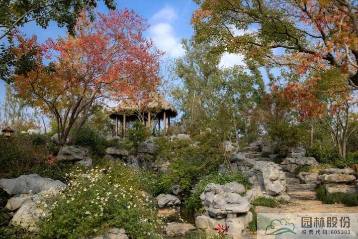 沿著山石小道拾級而上,便到了“問茶”展區,這里有一處茅草雙亭,是整個杭州園的制高點,可一覽全園風光,也可以遠眺園外風景。“綠色、智能、節儉、文明”是杭州第19屆亞運會的辦會理念,此次也同樣運用到了杭州園中,在建園初期,建設人員開挖出了不少大大小小的山石,并巧妙地就地取材,最小化干預,修建成了山石小路,這些石塊鋪成的園路與太湖石營造的假山溪澗融合在一起,渾然天成。