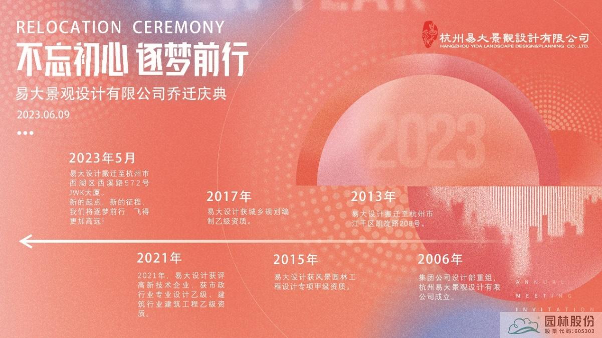 六月是花開的季節,摯愛的季節,感恩的季節,在這欣欣向榮的六月,我們相聚一起,熱烈祝賀杭州市園林綠化股份有限公司下屬杭州易大景觀設計有限公司喬遷至杭州市西湖區西溪路JWK大廈。園林股份總裁張炎良、副總裁李壽仁等領導參加了喬遷慶典。