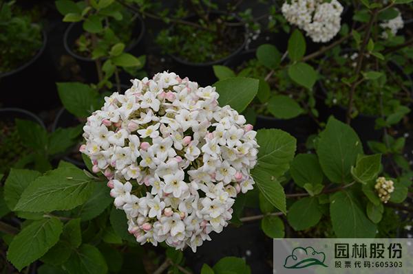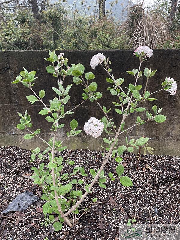 忍冬科莢蒾屬,落葉灌木,株高3-4.5 m,為瓊花和紅蕾莢蒾的雜交種。葉片較厚,較大,到秋季變成酒紅、橙紅或紫色色調(diào)。聚傘花序花蕾粉紅色,開放后白色,聚集似小雪球,具芳香,花徑8-14cm,花期3-4月。喜光,半陰環(huán)境也生長良好,生長速度中等;擇土不嚴,微酸性、中性至微堿性土壤均可生長,尤喜濕潤、排水良好的富含有機質(zhì)土壤;抗寒性強;耐修剪,適合自然風(fēng)格的工程應(yīng)用或庭院觀賞。
