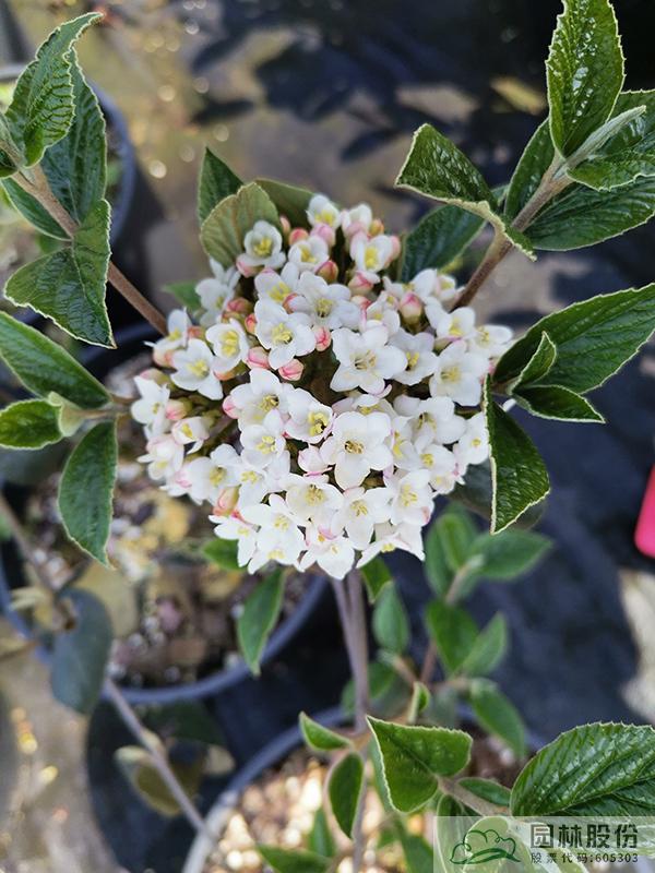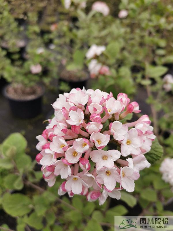 忍冬科莢蒾屬,半常綠或常綠灌木,株高2-3 m,為紅蕾莢蒾和煙管莢蒾的雜交種。葉色深綠,秋季轉(zhuǎn)紅,顏色程度因所處地區(qū)而異。該種繼承了紅蕾莢蒾粉花的優(yōu)良基因,花序未開放時呈現(xiàn)靚麗的粉色,開放后白色,且具有較濃郁的花香。花徑一般4.5-10 cm,花期3-4月。植株具有良好的頂端優(yōu)勢,枝條年生長量大,但分枝能力稍弱。幾乎無病蟲害。適應(yīng)性強,生長速度快,耐干旱且耐寒,適合自然風(fēng)格的工程應(yīng)用或庭院觀賞。
